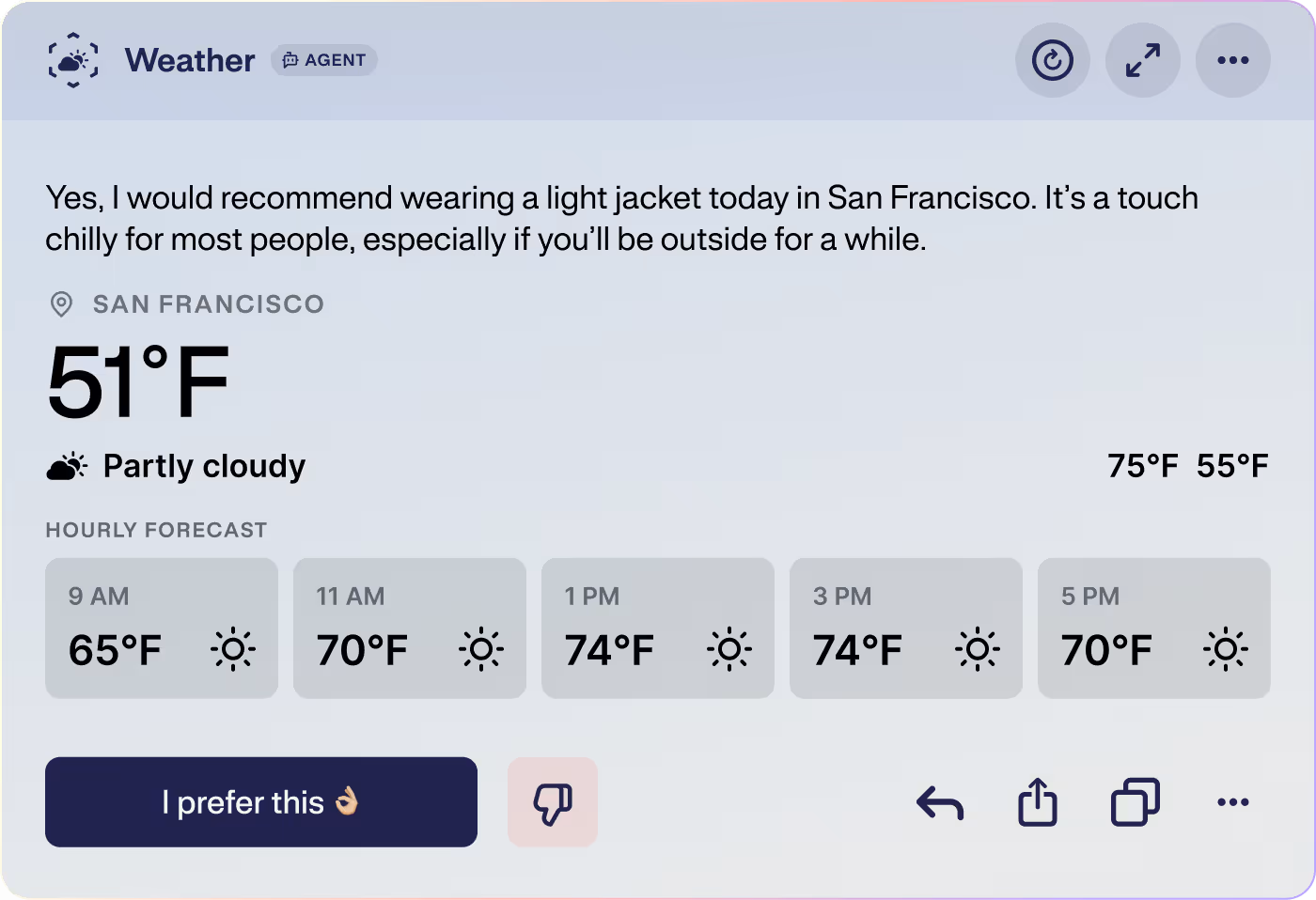 If the prompt box is the steering wheel, the response cards are the road ahead—equally essential. We spent many hours exploring various versions of these response cards, ultimately settling on a dipped-in-color design that puts the brand colors of the AIs, and their personality, front and center.