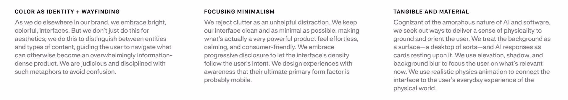 Clearly branding the AIs in distinctive, branded cards had a secondary effect: it let us make everything else more background, including "us" (our own AI voice).